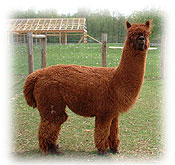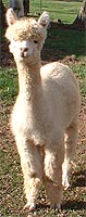 We chose Miguel as a foundation for our huacaya breeding program. He's a stocky full Peruvian brown boy sired by Double O Good's Black Cloud Boy. Miguel picked up a Blue Ribbon for his fleece at the 2003 Alpacarama.